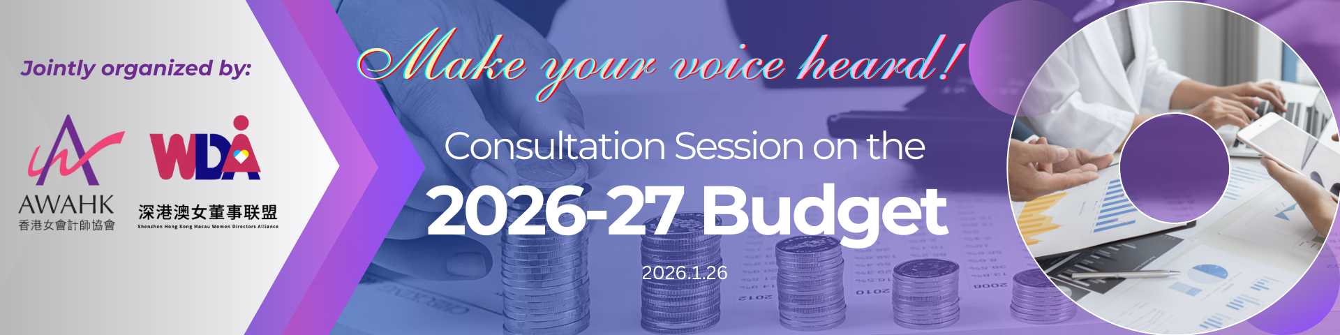 Join us for an insightful consultation session with Ms. Lusan Hung on January 26, 2026. This is a great chance for you to share your thoughts on key budget issues. Your input will help shape the financial planning process. As key players in Hong Kong's economy, your contributions are vital for creating a budget that meets community needs and supports sustainable growth.