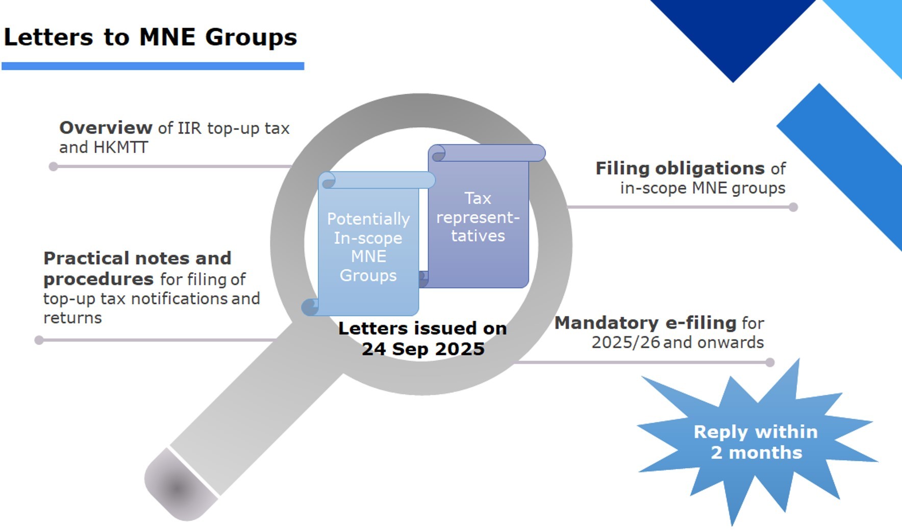 The IRD has issued letters to potentially in-scope MNE groups requesting those in-scope ones to provide a list of Hong Kong entities of the group that will be subject to mandatory e-filing for the year of assessment 2025/26. The reply deadline of 24 November 2025 is approaching.